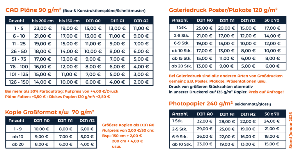 Digitaldruck (Klein- & Großauflagen): z.B. CAD-Pläne, Roll-Ups, individuelle Aufkleber, Plakate, uvm.